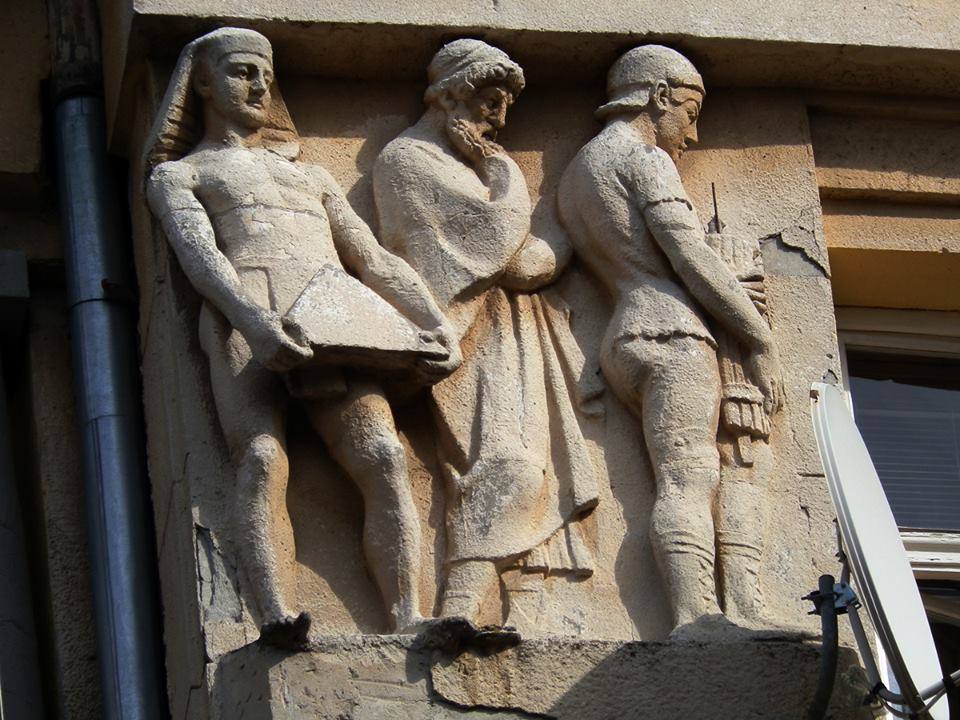 Let’s start with something exotic. Розпочнемо з незвичного й далеко не найвідомішого, але вкрай актуального, виходячи з заданої теми. Зовсім не в центрі Львова, але ще і не на його окраїнах, а саме поблизу “найзеленішої” львівської вулиці є вулиця Йосафата Коциловського. З Зеленою її сполучає Переяславська. На Йосафата Коциловського, під №15, знаходиться житлова кам’яниця. Її було побудовано в 1911 році, за проектом архітекторів Генрика Заремби та Юліана Пінкерфельда. Споруда сама по собі приваблює погляди перехожих, але завдяки оздобленню її п’ятьма алегоричними барельєфами, не залишає байдужим нікого. Автором цих витворів є скульптор Тадеуш Блотніцький. Один з барельєфів, який найбільш цікавий нам – “Давні цивілізації”. На ньому зображено трьох фізично розвинених чоловіків, образи яких стилізовано під характерні для окремих зі стародавніх цивілізацій характеристики. Ці цивілізації – це Єгипет, Греція та Рим.
