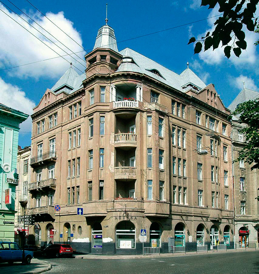П’ятиповерховий, колишній прибутковий будинок Фейвела Френкеля. Збудований протягом 1909–1912 років на розі з нинішньою вулицею Князя Романа. Проект у формах раціонального модерну розроблено Тадеушем Врубелем і Максимільяном Бурстіном у бюро Станіслава Улейського і Кароля Ріхтмана-Рудневського. Після Першої світової війни будинок придбано Касою хворих, яка влаштувала тут лікарню, а на першому поверсі — аптеку.