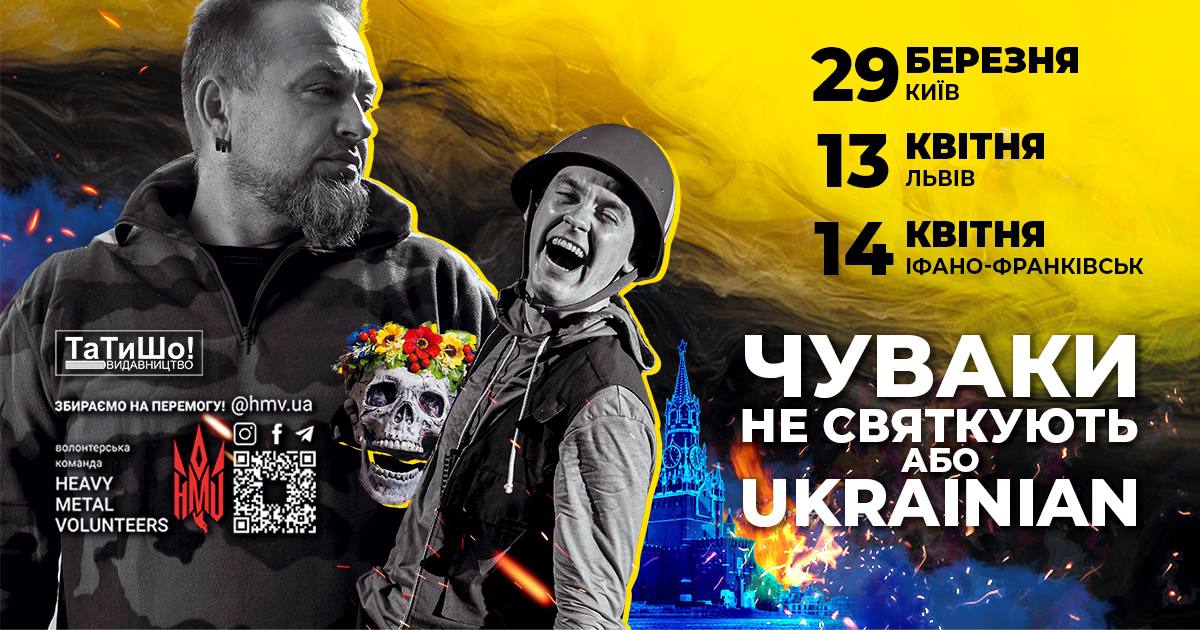 Квитки на виставу “Чуваки не святкують, або Ukrainian” 13 квітня у Львові (в Палаці культури залізничників “РОКС”) доступні онлайн (ціна – від 200 до 550 грн.): https://lviv.kontramarka.ua/