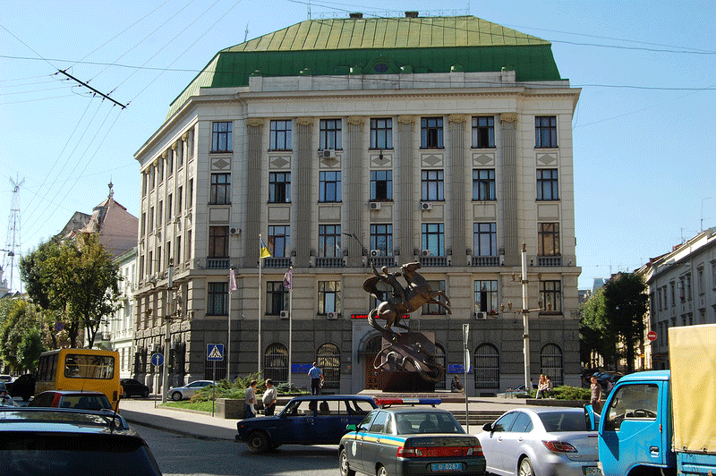 Колишній будинок Торгово-промислової Палати. Побудований у 1907–1910 рр. за проектомАльфреда Захаревича і Тадея Обмінського. Основну частину будівельних робіт виконувала будівельна фірма Івана Левинського.