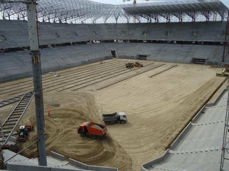 - 17 травня 2011 року на футбольному полі розпочались земельні роботи, а на початку червня – з монтажу системи дренажів, розпочато влаштування щебеневої основи та системи поливу. Ухвалене рішення про настил рулонного газону. За 100 днів до завершення будівництва загальна готовність стадіону становила 75%.