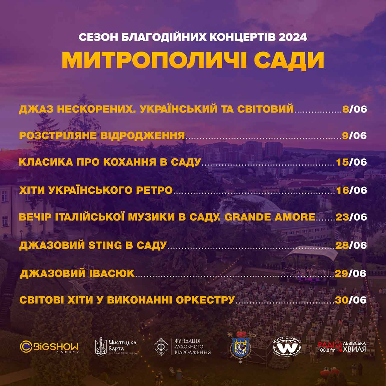 – Жива музика в унікальній атмосфері Митрополичих Садів і з чудовим краєвидом на вечірній Львів настільки полюбилися львів’янам та гостям міста, що меломани з нетерпінням чекають старту концертів просто неба, – розповідає директор Благодійного фонду «Мистецька Варта» Євген Кравчук. – В останні роки кожен придбаний квиток на наші події – це ще й допомога Збройним Силам України, які роблять можливими ці літні музичні вечори. Частину коштів, вилучених з продажу квитків, ми спрямуємо на закупівлю FPV дронів для 24-ої окремої бригади імені короля Данила.