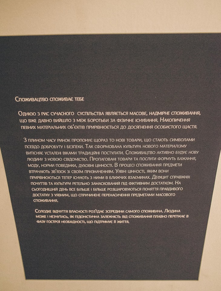 Серед робіт на виставці „Міста, що зникають: наступна частина“ в Музеї міста чи не найбільше уваги відвідувачів привернула інсулінова інсталяція. „Споживацтво споживає тебе“. Головний месидж, який митець хотів донести глядачам, — надмірне споживання, накопичування різноманітних матеріальних псевдоцінностей, врешті знищує справжні духовні цінності, правдиві почуття. Підміна понять змінює людську сутність.