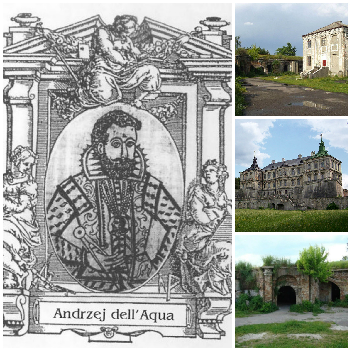 Андреа дель Аква був інженером та архітектором, артилеристом та будівельником…список можна продовжувати, але на цьому зупинимось. І так виходить дивна суміш будівельно-руйнівних професій. Але сходе на те, що фраза “ламати не будувати” точно не про нього. Радше навіть навпаки. Він народився 1584 року, походив з Венеції. На початку XVII століття переїхав до Речі Посполитої і працював інженером при дворі Сенявських, а потім Замойських. На теренах Речі Посполитої здобув собі славу майстра зведення оборонних споруд та фортифікацій. Працював головно зі шляхетськими родами (Конецпольські, Острозькі, Заславські, Замойські, Сенявські і ін.) та їхніми проектами. В більшості його робіт простежуються властиві в той час для голландської та італійської архітектури риси.