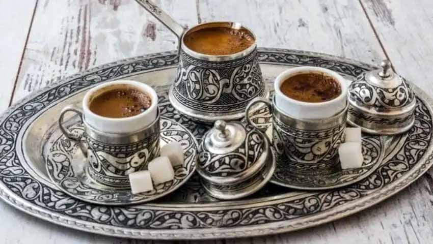 Для араба гість це свята особа. Отже в першу чергу подорожного приймають філіжанкою кави перед шатром вожда, голови роду. Пиття кави злучене з традиційними церемоніями. Чарку з кавою треба держати у правій руці, бо якби навіть хтось лиш сягнув по неї лівою рукою, вважають це великим нетактом. Пити мусить гість малими ковтками та, борони Боже, не похвалити кави. Вдоволення треба виявити у сміхом і конче попросити ще одну чарку кави, що означає, що кава гостеві справді смакувала.