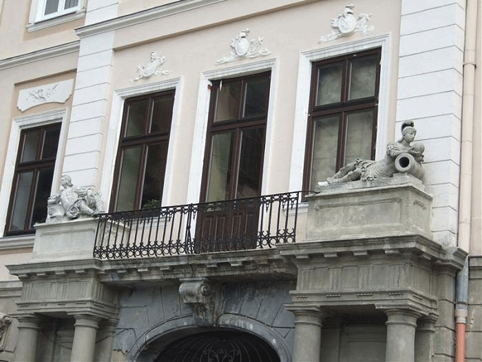 В середині XIX ст. і у 1907 році проводились реконструкції будівлі. Над вікнами першого поверху, в місцях розміщення замкового каменю вмонтовано гротескні маски сатирів. На другому поверсі — рельєфи з військовими символами, які стали своєрідними символами будинку.