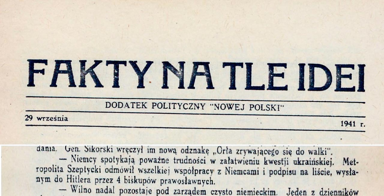 Тут слід згадати й про повідомлення польської конспіраційної газети «Fakty na tle idei», яка була політичним додатком друкованого органу польської підпільної організації «Konfederacja Narodu», що вже у вересні 1939 року у Шептицького не було ілюзій щодо німецьких планів і він «відмовився співпрацювати з німцями та відмовився підписати лист до Гітлера, підписаний і висланий чотирма православними єпископами».