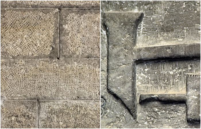 Це сліди так званого бучардування. Термін походить від французького слова “бучарда” (фр. boucharde), яким називають молоток, у якого одна з ударних поверхонь покрита пірамідальними зубцями, званими “діамантові наконечники” (фр. pointe-de-diamant).