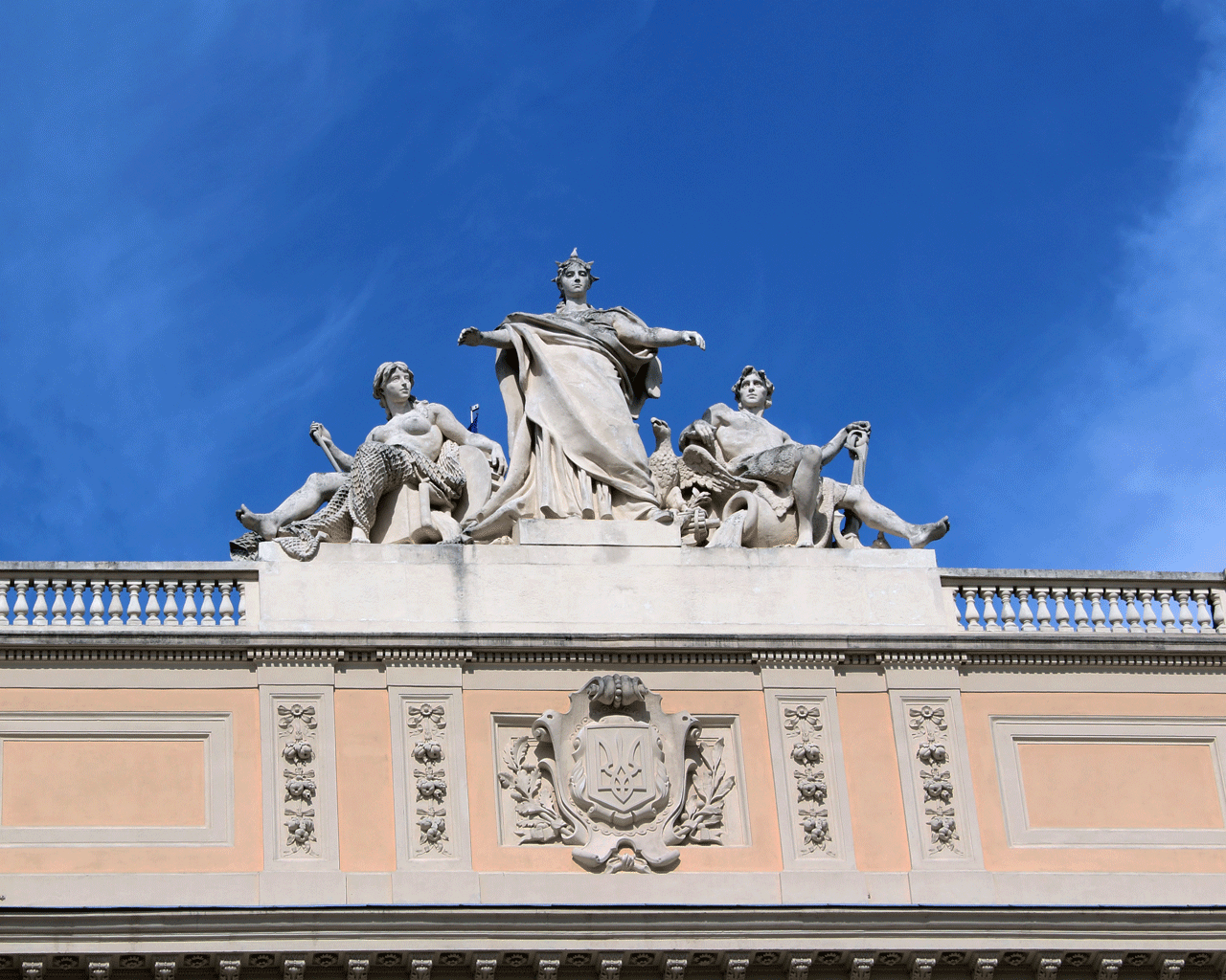 Головна скульптурна група має назву “Опікунський дух Галичини”, і була створена у 1880–1881 рр. скульптором Теодором Ріґером в Італії. У центрі композиції ми бачимо жіночу постать — Галичину, яка простягає руки до розміщених з обох сторін Дністра і Вісли, які символізували українці і поляків. За майстерно виконану роботу він отримав звання почесного члена Флорентійської академії мистецтв. Традиційний для академічного мистецтва характер мають фігури створені Зиґмунтом Трембецьким та Феліксом Мікульським. Вони виконали постаті, які символізують Віру і Справедливість, та Освіту і Працю. Дев’ять левів навколо вінця будинку, що тримали щити з гербами міст королівства Галичини, ймовірно, авторства Тадеуша Баронча.