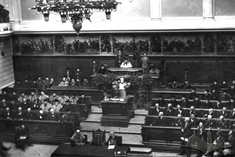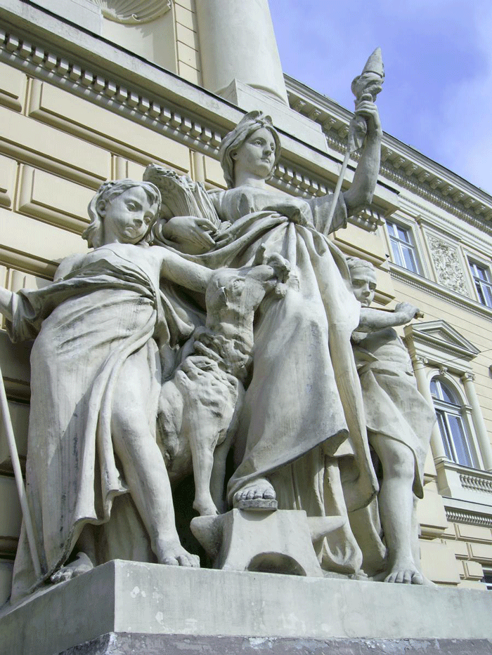 Колишній будинок Галицького сейму (тепер головний корпус Львівського національного університету імені Івана Франка) окрім своєї утилітарної мети, несе ще й значний пласт більш глибоких смислів. І втілювали їх як скульптури на фасаді, так і цілий ряд елементів інтер’єру. Чимало з нас, проходячи повз будівлю Університету, не звертає на це увагу. А дарма. Адже і у наші дні, полишивши на мить свої буденні турботи, достатньо лише підняти голову, щоб полинути у таємничий світ скандалів, таємниць та символів ХІХ століття.