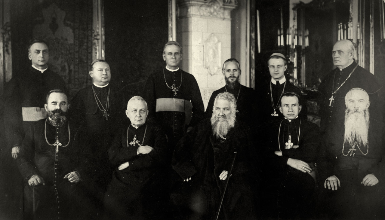 Стоять: генеральний вікарій зі США Йосиф Гануля, Апостольський екзарх США Василь Такач, єпископ з Чехословаччини Петро Гебей, єпископ Кирило Куртев (Болгарська греко-католицька Церква), Павло Гойдич — греко-католицький єпископ Пряшівської єпархії, генеральний вікарій зі Львова Олександр Бачинський.