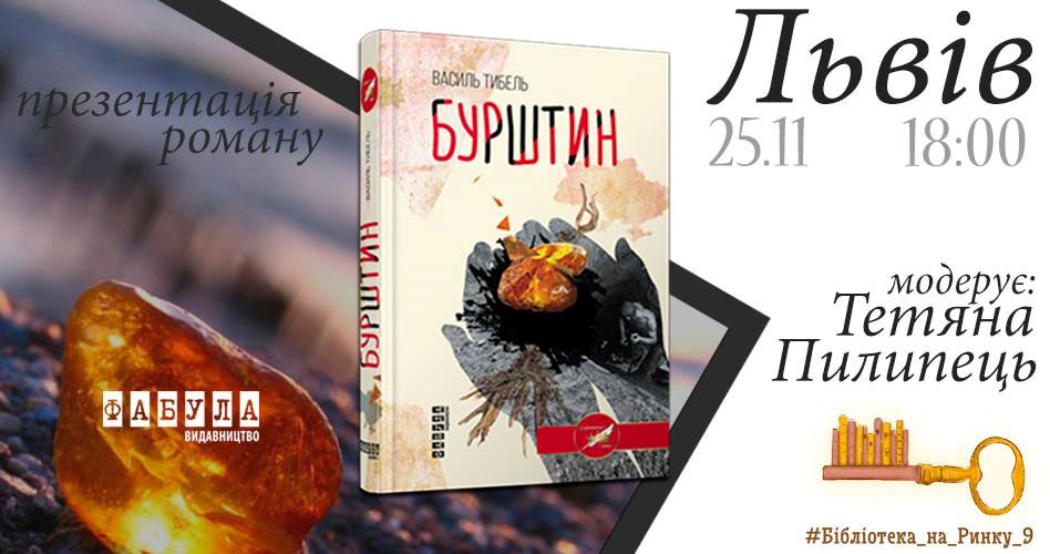 У неділю, 25 листопада 2018 року, о 18:00 у читальному залі Львівської обласної бібліотеки для юнацтва (Бібліотека на Ринку – площа Ринок, 9) відбудеться презентація роману Василя Тибеля “Бурштин”.