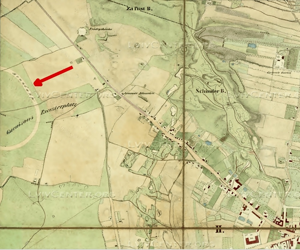 План міста Львова 1844 року. Стрілкою вказано на іподром.