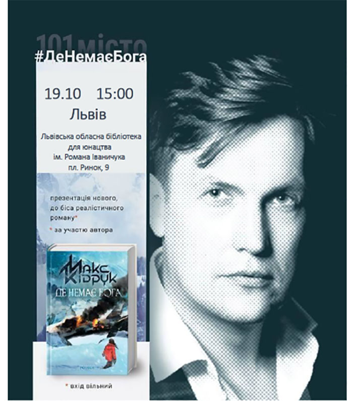 Письменник Макс Кідрук знову вирушає в масштабний тур обласними центрами та маленькими містечками України, аби зустрітися з читачами та презентувати роман «Де немає Бога».