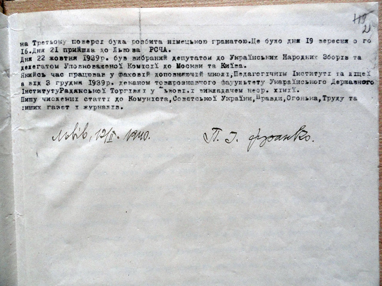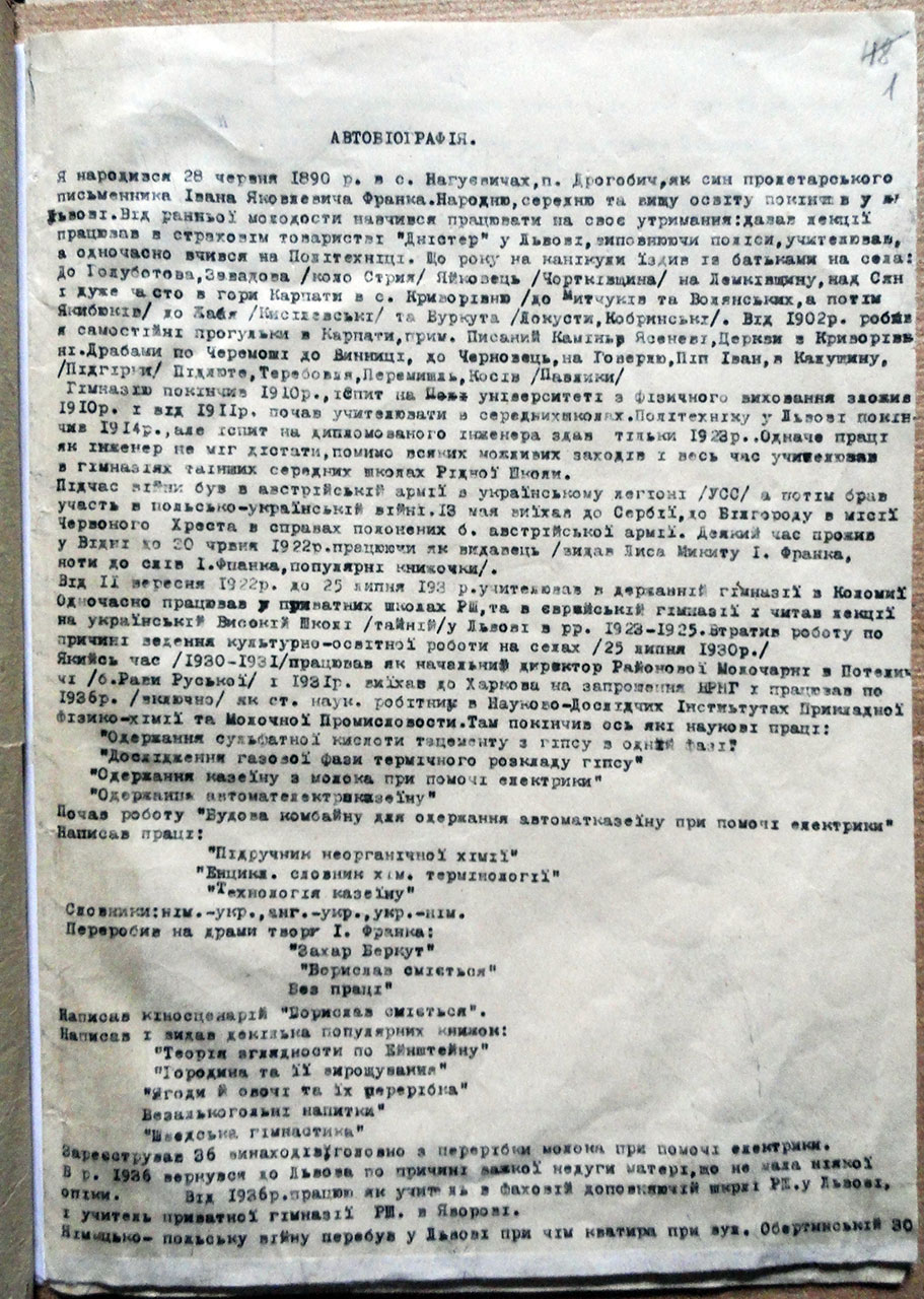 Перший документ – автобіографія Петра Франка, написана 10 лютого 1940 р. на вимогу Забаштанського – завідуючого оргінструкторського відділу Львівського міського комітету Комуністичної партії (більшовиків) України. Цікава деталь, повідомлення від Львівського міського комітету КП(б)У надійшло до Петра Франка вранці 10 лютого 1940 р. У ньому зазначалося наступне: