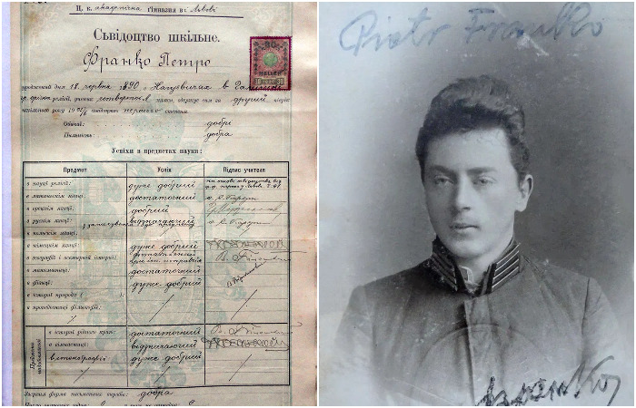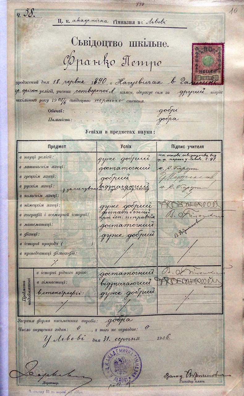 Наступний документ – гімназійне свідоцтво Петра Франка – учня Академічної гімназії у Львові за друге півріччя 1905/1906 н. р., видане 31 серпня 1906 р. У ньому вказано предмети, які викладалися у гімназії, успішність та підписи учителів. Щоправда у документі не правильно написано дату народження Петра Франка.