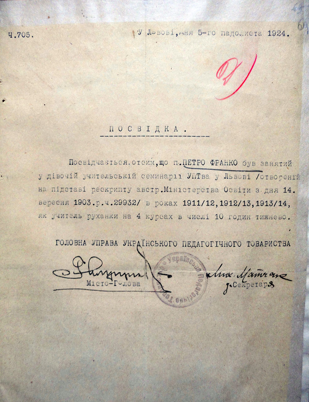 І, нарешті, останній документ, – це довідка, видана Петрові Франку про те, що він упродовж 1911/12 – 1913/14 навчальних років працював учителем руханки у дівочій учительській семінарії Українського педагогічного товариства у Львові. Зазначу, що саме під впливом професора Академічної гімназії Івана Боберського, Петро Франко обрав фах учителя руханки (фізкультури).