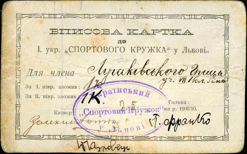 Третій документ – вписова картка (посвідчення) Гриця Лучаківського – члена Українського спортового кружка (УСК), завірена Петром Франком – головою УСК. Попри те, що упродовж 1906 р. (від заснування УСК) до Першої світової війни його членами було декілька сотень гімназистів і УСК провадив бурхливу діяльність, документів з цього періоду збереглося обмаль. На сьогодні, це чи не єдине, посвідчення, яке збереглося. Нагадаю, що УСК був організацією, яка була створена Іваном Боберським на базі Академічної гімназії та її філії для популяризації різних видів спорту у Львові та Галичині. Одним із провідних членів УСК був Петро Франко. Свої здібності у спорті проявив у копаному м’ячі (футболі), ситківці (великому тенісу), легкій атлетиці, важкій атлетиці тощо.