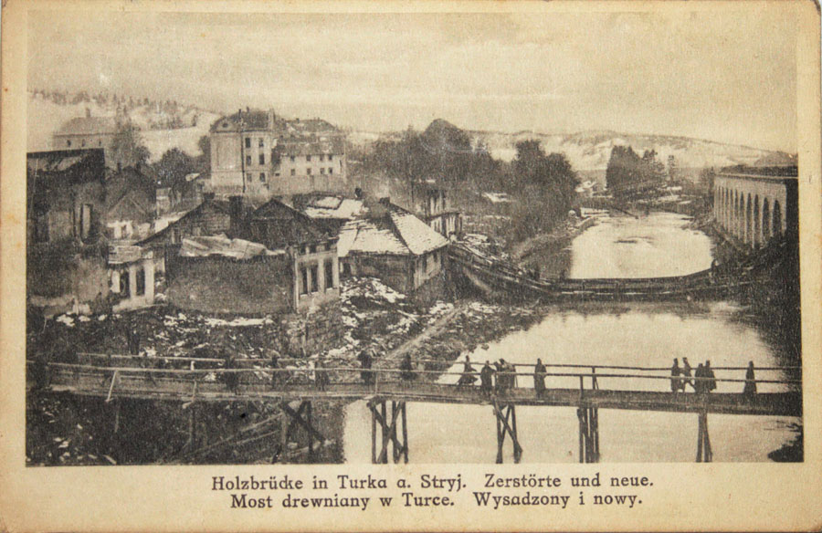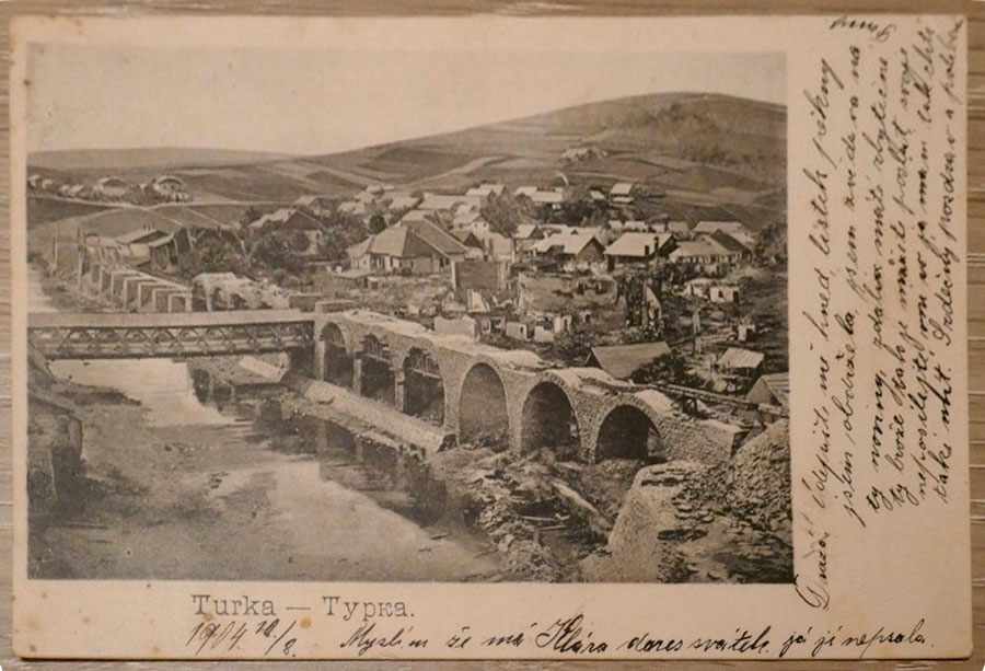 Критий міст у м. Турка на Львівщині був розташований над річкою Стрий у самому центрі міста, тому він потрапив на дуже значну кількість фотографій і поштівок. Найстаршою зі знайдених світлин є фото з часів будівництва залізничного віадуку у 1904 році. Невідомо, чи будували їх водночас, чи піший міст у такому вигляді існував раніше, але можна прийняти цей рік, як перший фотографічний документ існування критого дерев’яного мосту у м. Турка.