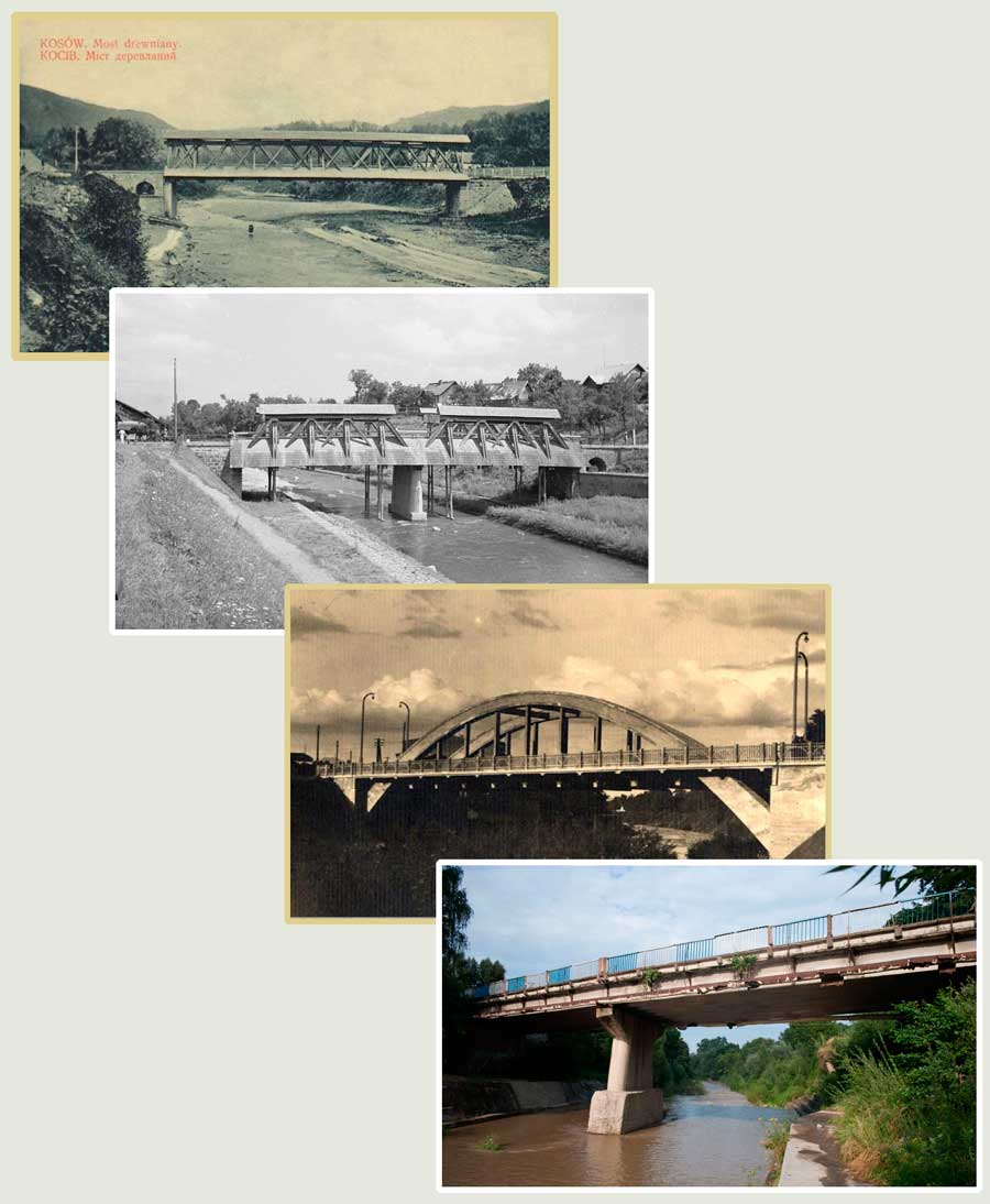 Але потім Банський міст перебудували… На чотирьох наступних світлинах видно, що після незначної конструктивної зміни (поява додаткової опори посеред річки) наступила радикальна перебудова – після повені 1937 року дерев’яний міст поступився збудованій поруч залізобетонній арковій конструкції. Цей новий міст був гарним і міцним, але 23 червня 1941 року підірвали його перші Совіти, втікаючи перед гітлерівцями [10]. Після війни другі Совіти збудували банальний залізобетонний міст, в результаті чого Косів втратив частинку своєї краси.