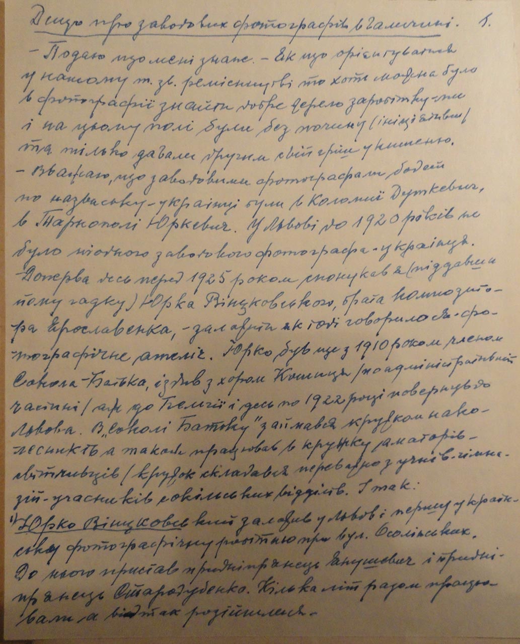 Подаю що мені знане. – Як що орієнтуватися у нашому т[ак] зв[аному] ремісництві то хоть можна було в фотографії знайти добре жерело заробітку – ми і на цьому полі були без почину (ініціятиви) та тілько давали другим свій гріш у кишеню.