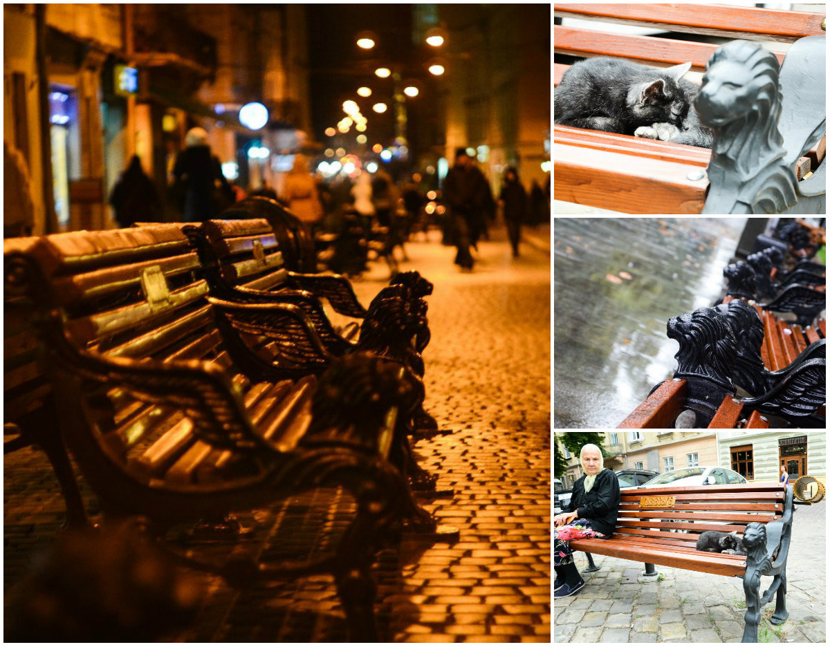 Лавочки у центральній частині місті прикрашені крилатими левами. Розташовані вони на проспекті Свободи, площі Ринок та прилеглих вуличках. Дерев’яні конструкції доповнюють металеві поручні у формі левів. Царі звірів сумлінно охороняють туристів та жителів міста, які присіли відпочити і помилуватись красою навколишніх будинків.