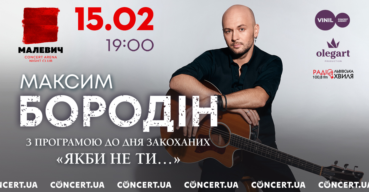 Неймовірно романтична програма «Як би не ти…» від півфіналіста “Голосу країни-12”! 15 лютого у Malevich Concert Arena виступить український співак Максим Бородін. Початок концерту о 19:00, повідомили організатори VINIL Concert agency.