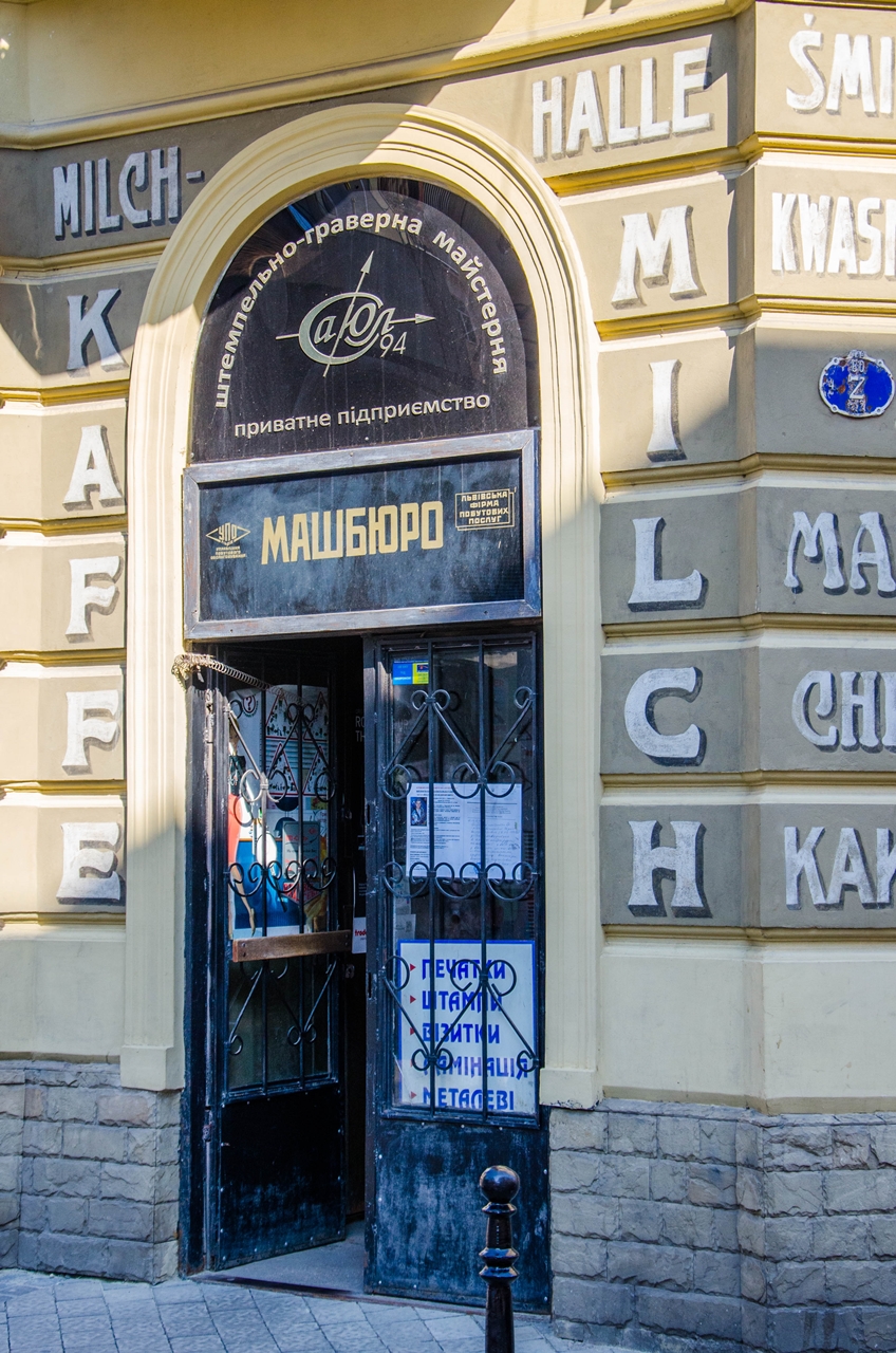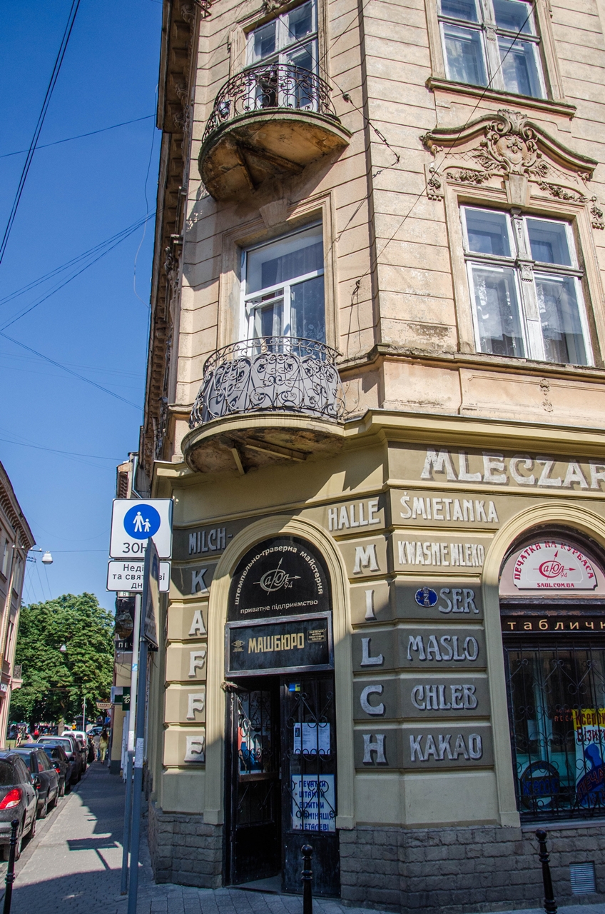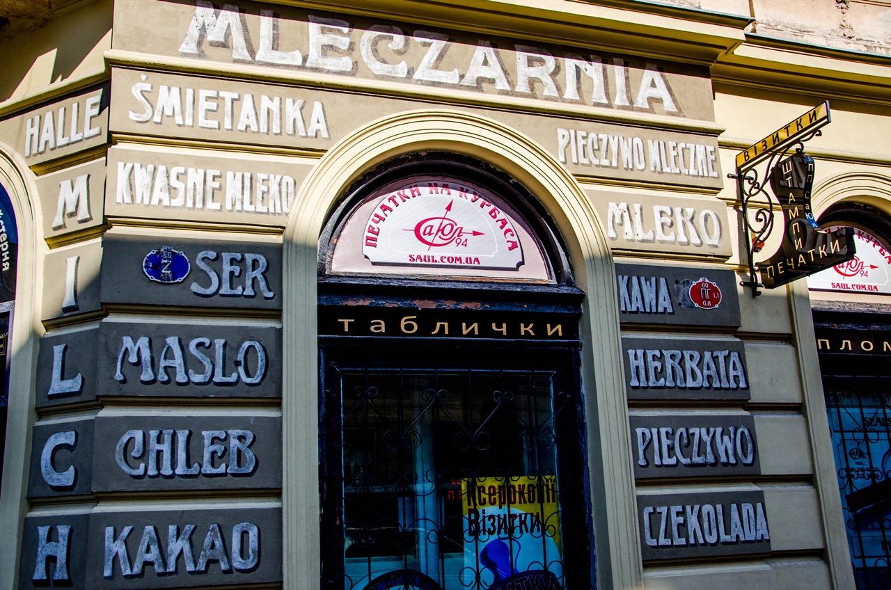 Відреставровані або видобуті з-під шару штукатурки написи на стінах перших поверхів будинків можна бачити у середмісті. Серед вивісок трапляються такі: «кав’ярня», «молочарня», «продукти», «хліб», «чай», «тканини» та ін.