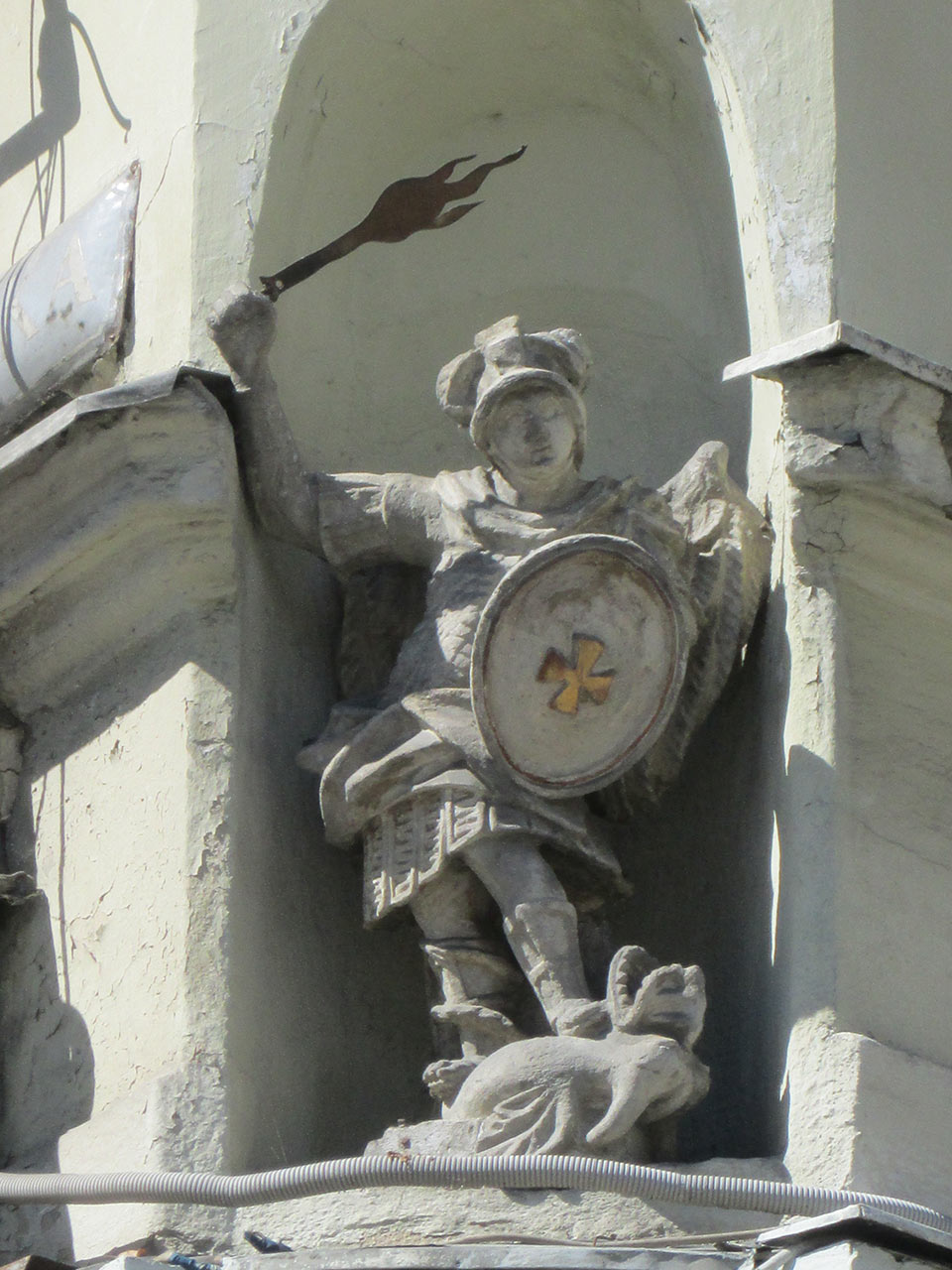 На вул. Галицькій є скульптурна композиція «Святий Михаїл перемагає дракона», хоча частіше архангел зображається у вигляді воїна, що перемагає люцифера (також сатану чи диявола). У Львові є ще дві скульптури Святого Михаїла, в котрих диявола традиційно зображено у людській подобі – в Музеї-Арсеналі і на фасаді будинку на вул. Друкарській, 11. Я приведу для порівняння світлини усіх трьох скульптур.