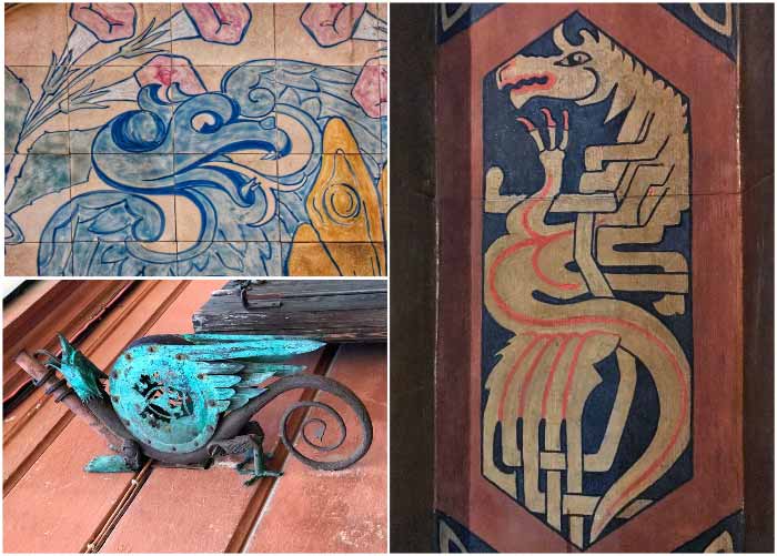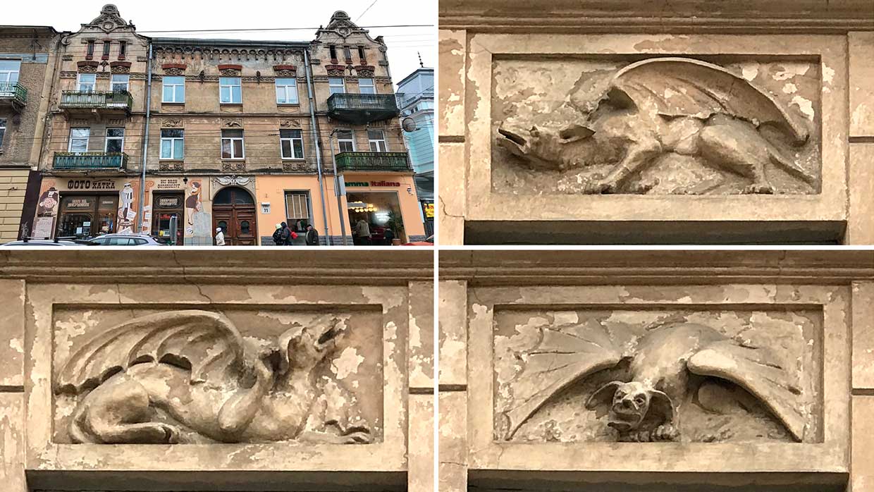 Тому спочатку пропоную подивитись на безсумнівних драконів на фасаді будинку на вул. І. Франка, 71. Ці істоти мають не зміїні або пташині, а виразно собачі голови, а один навіть почісує лапою вухо, цілком як пес. Втім, наступні два виглядають дуже грізно, як і належиться драконам – один хижо підкрадається, другий ніби приготувався до стрибка.