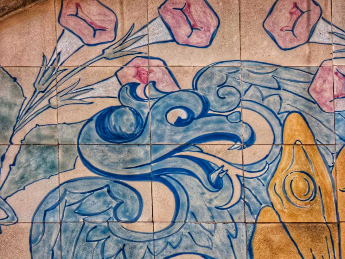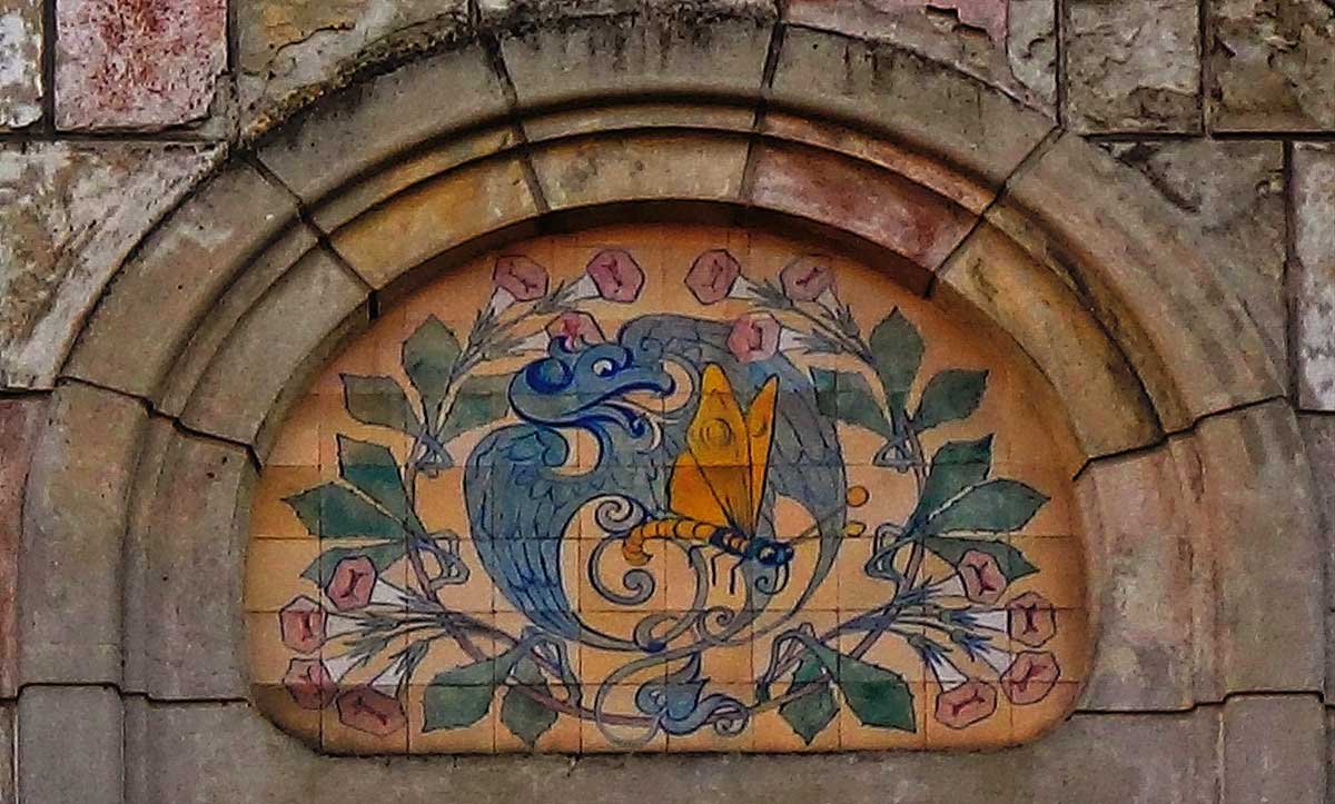 Ще одне художнє зображення дракона можна побачити на причілку будинку на вул. Котляревського, 17-19. На перший погляд здається, що автор розмістив на яскравому панно квіти, бабку і пташинку. Але при наближенні видно, що ця птаха має хижий дзьоб з іклами і по-зміїному роздвоєний язик. Складно сказати, чи це дракон, чи якась інша міфічна тварина (наприклад, амфіптер), але я таки додам її до цього бестіарію.