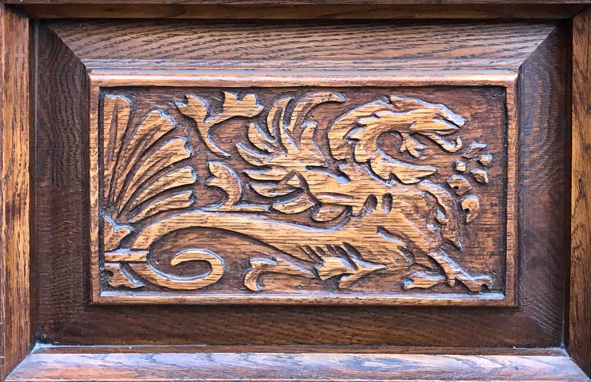 Подібні крилаті бестії «вгадуються» на гарно вирізьблених дерев’яних вставках дверей на вул. Вірменській, 14.