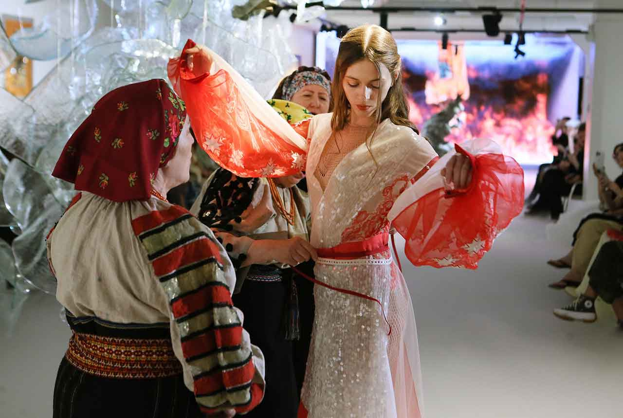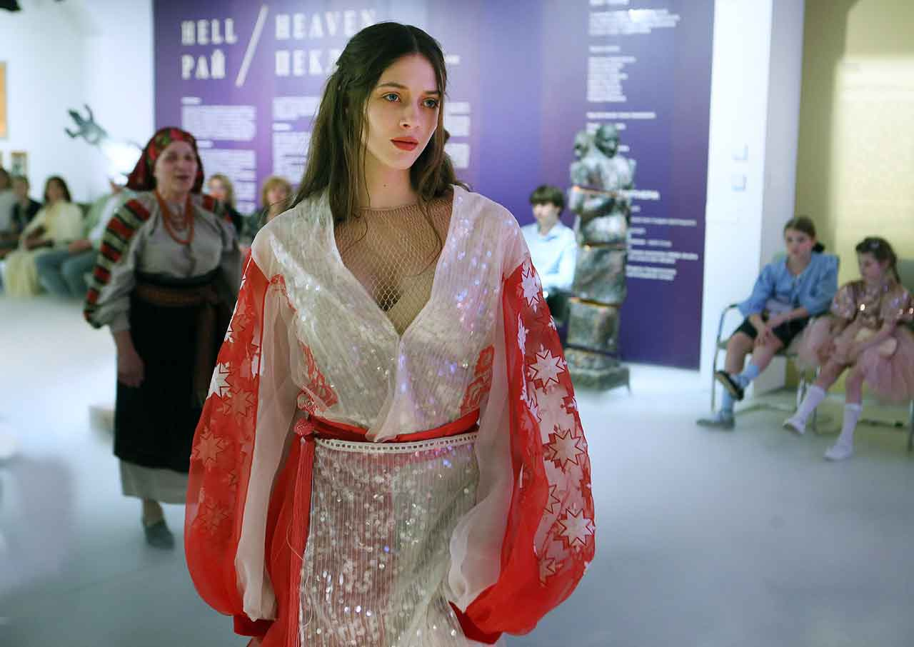 Близько двадцяти моделей не просто дефілювали, а творили сенси та змісти – із проекцією з минулого на теперішнє та майбутнє. У центрі фешн-перформансу – Жінка: світла і темна, пуста і глибока, кокетлива і цнотлива, змінна і вічна. Вона ніколи не буває одновимірною.
