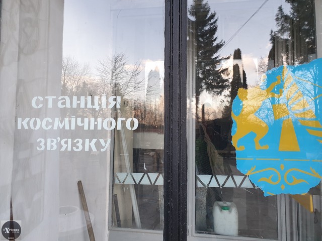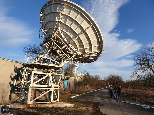 Територія центру космічних досліджень, с.СасівПоки не сіло сонце нам проводять огляд території32-м японська антена на передньому плані, 25-м радянська на задньому. Фото Ю. РудийКоли не було оптоволокна та інтернету то дзвінки з Союзу в Америку йшли через цю антенуВ круглій будівлі під поворотним пристроєм для 25-м антениПід 25-м антеною. Все виконано по військових корабельних стандартах