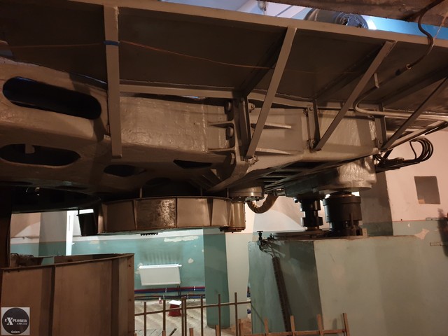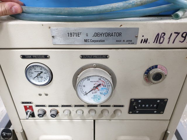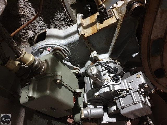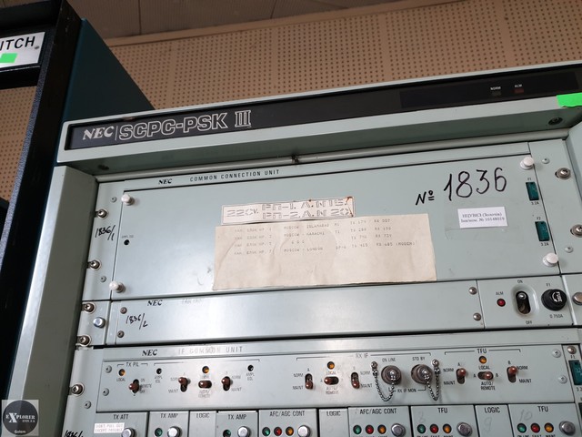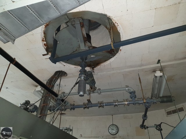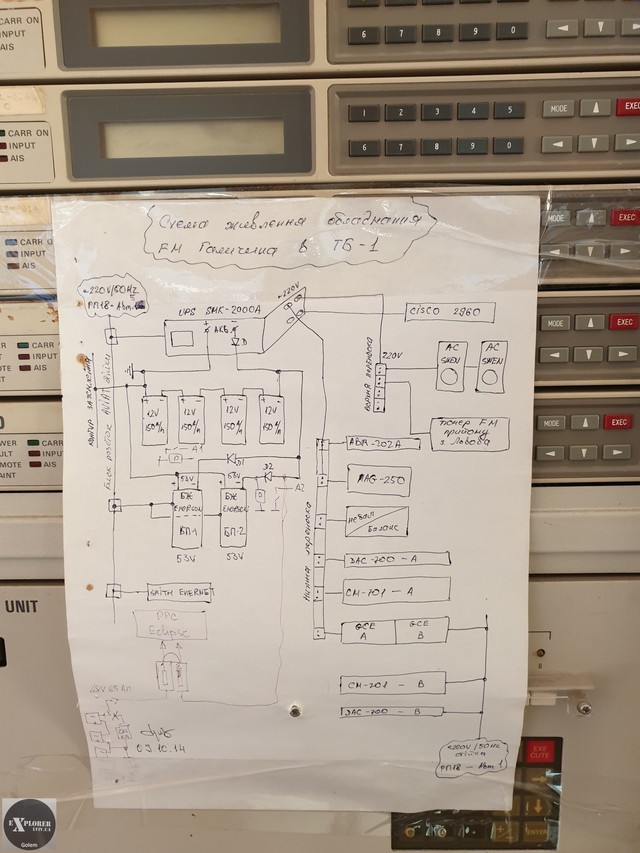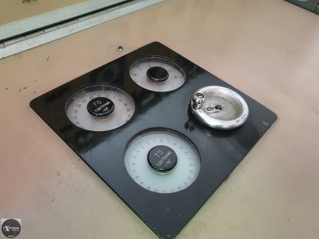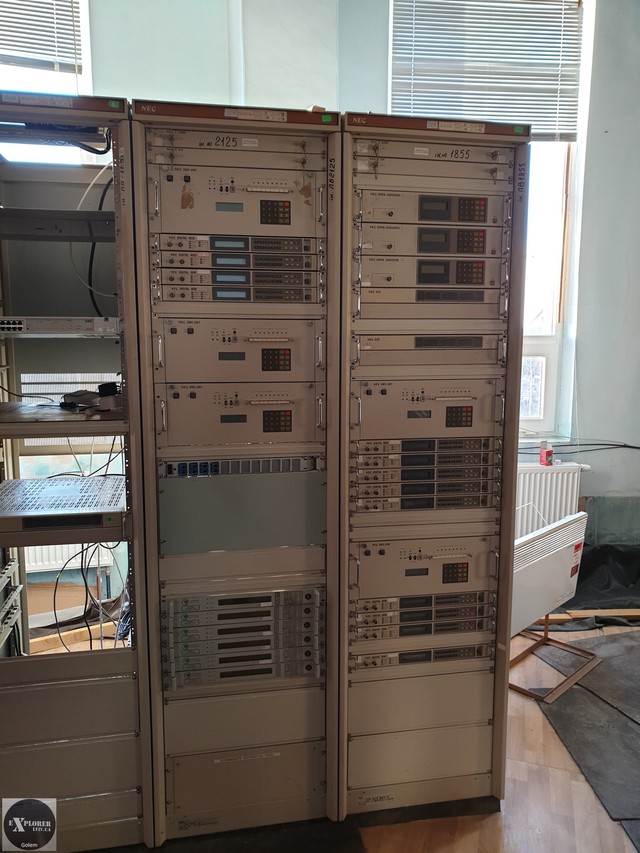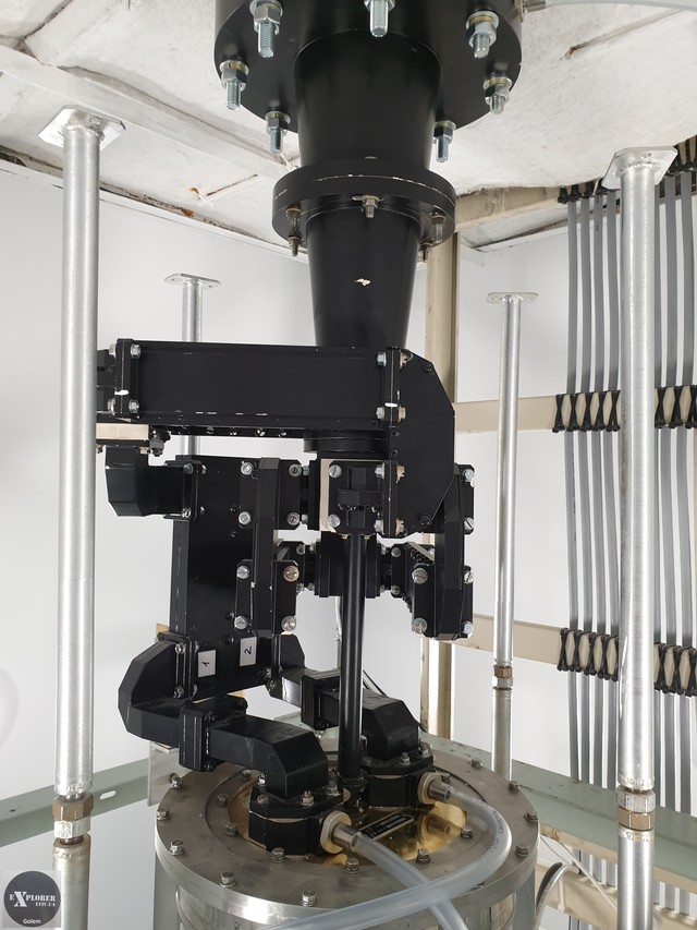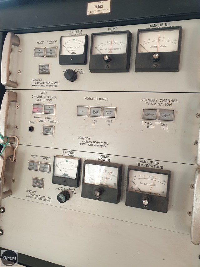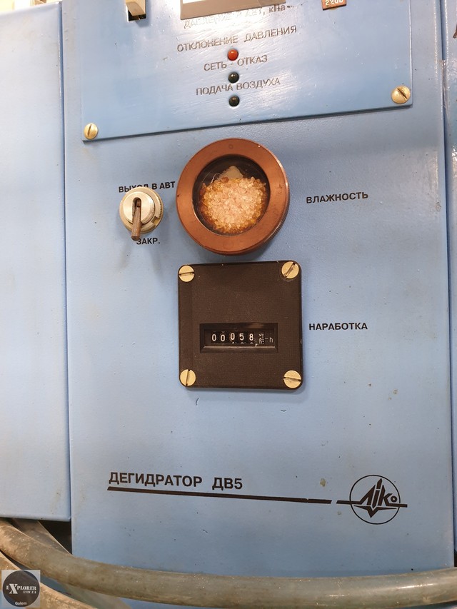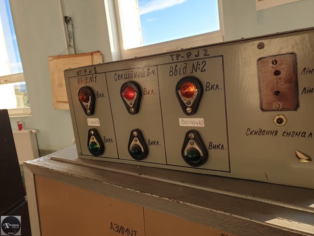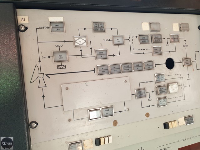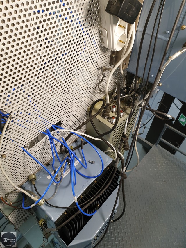 Серце антени 32м. Ми зараз під її центром. Ці чорні трубки це хвилеводи. У них попадає прийнятий сигнал з антени через систему дзеркал (в трубах). Тут він подається на приймач. Він на фото внизу такий блискучий. Повітря в хвилеводі осушується щоб не утворювався конденсат. Для цього є ці дві прозорі трубки.Японський осушувач ще на місці і робочийПоруч є радянський осушувачЧастина сучасних приймачів.