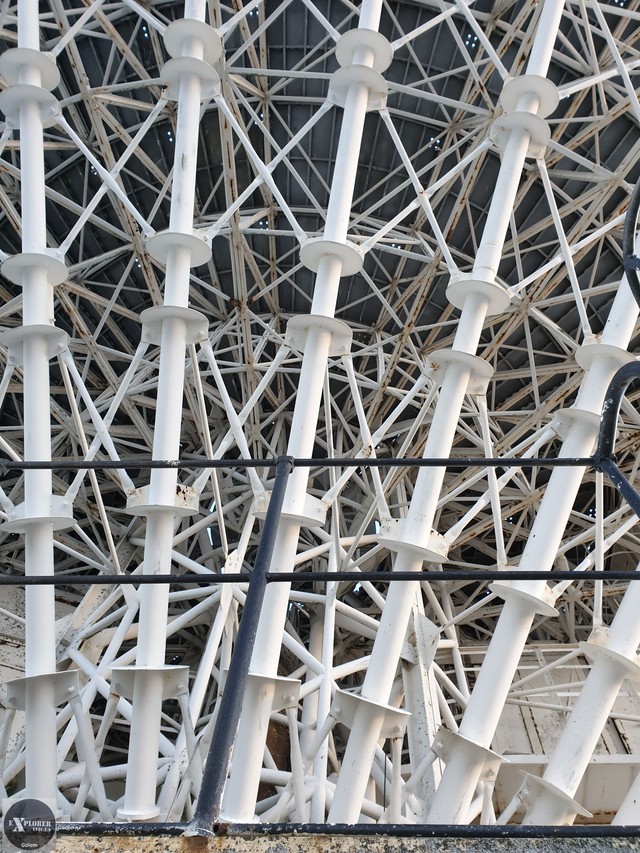 Громадіна! Гляньте на дерева внизу для масштабу!На будівлі видно направляючі по яким антена обертається навколо своєї осі. Вище є двигуни та механізм щоб повертати її у вертикальній площині. Труба по центру це система дзеркал які направляють сигнал в апаратну. На все про все йде лише 7кВт електрики. Коли антена виведена на потрібну точку то вона фіксується штирями. Таким чином знімається навантаження з механізму та двигунів.