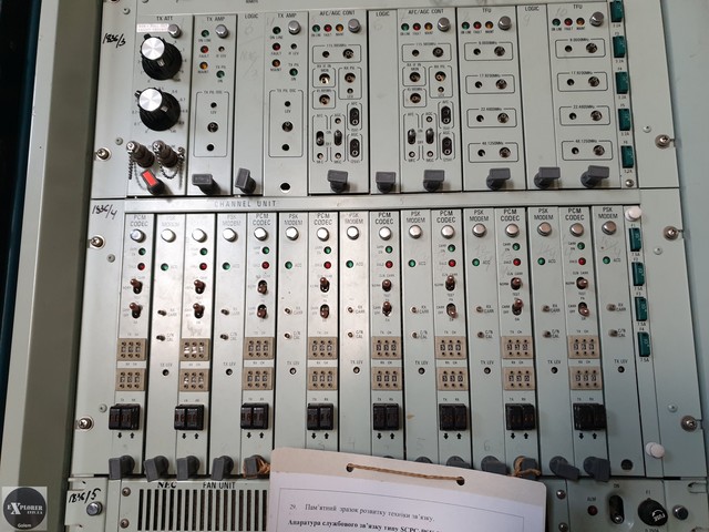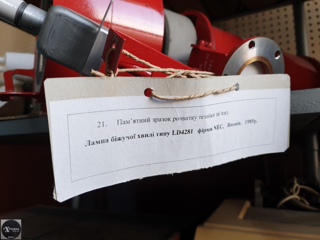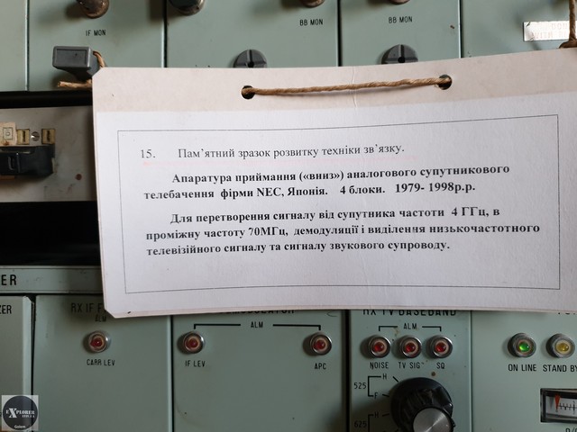 З телевізійної частини центру зробили музей. Це лампа біжучої хвилі. Вона підсилює високочастотні сигнали. Японська!Майбутні експонати музеюСтійки що використовувалися для телебачення і радіоОго! Ото схему замутили чисто по-галицьки!Музей телетехніки що тут лишилася. Молодці що не викидають. Схожу техніку ми бачили на Високому замку.Tektronix це зараз крута фірма шо випускає вимірювальне обладнання. А тоді звичайні монітори.Тут колись контролювали що і як вони приймають та передаютьЗвісно що урядовий зв’язок йшов зашифрованийСтійка модуляторів. PSK – phase shift keying. Фазова модуляція по нашому.Дуже дивно шо апаратура для контролю якості телевізійного сигналу закордонна. Можливо з Америки ми приймали NTSC і тут на місці конвертували у вітчизняний SECAM.Ця штука створює на виході довільну частоту яку задали.Це такий от складний декодер звуку був на телебаченніУкраїна – це космічна держава. Космос – зона наших національних інтересів. Тому останніми роками ведуться активні роботи по відновленню української космічної галузі. Центр співпрацює з іноземними фахівцями, плануються спільні наукові проекти. Дуже приємно що армія в нас прагне бути західного взірця. А саме – комунікувати з цивільним населенням, показувати чим вони займаються, вести просвітницьку діяльність. А не як в Союзі де все було «ніззя» і «сєкрєтно».Екскурсія об’єктом. (с)фото Станіслав Сніжко