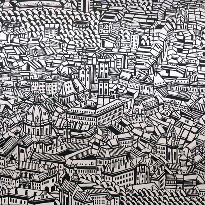 Не обійдеться і без хрестоматійних чорно-білих зображень архітектури Львова, зокрема зображення з афіші виставки – «Середмістя Львова», ліногравюри 2006 року.