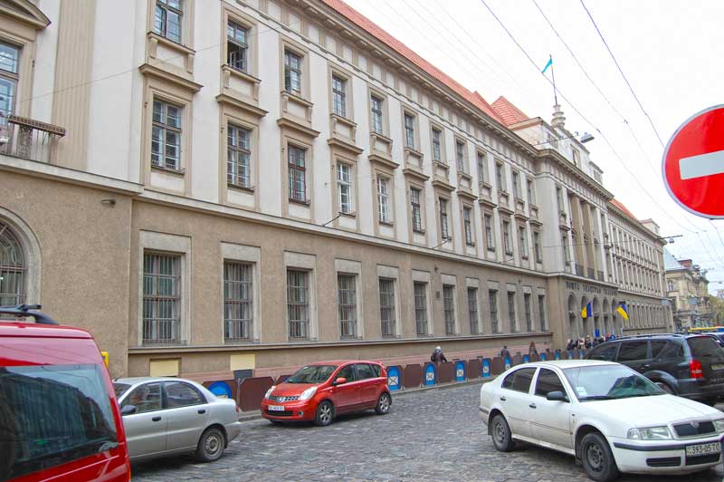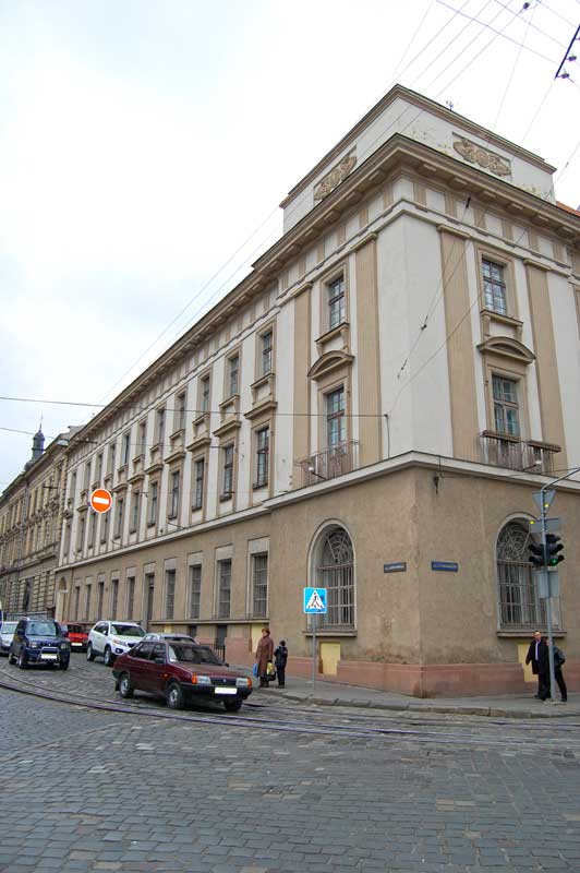 В центрі споруди над головним входом – знаходився великий годинник, на рівні першого поверху – світильники; ліворуч головного входу перед будинком – криниця, яку оминала трамвайна колія.