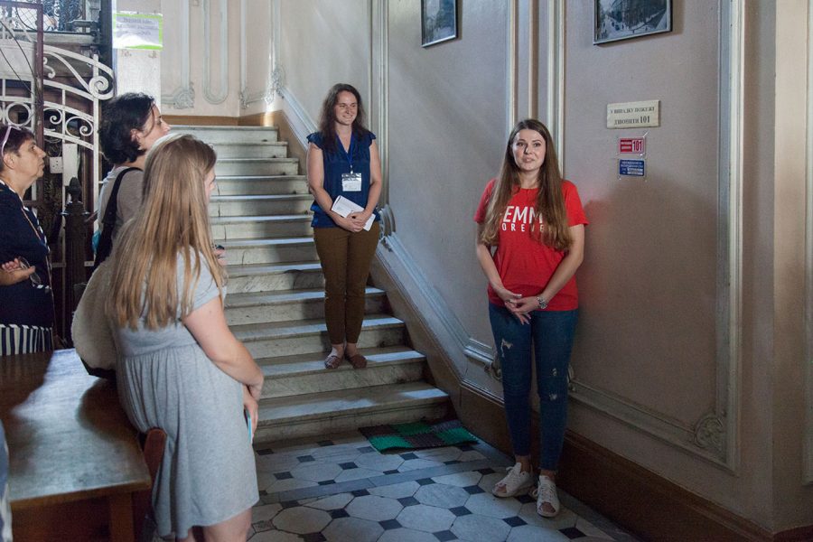 Продовженням кураторської екскурсії стало знайомство власне з палацом Бадені, в якому нині функціонує бібліотека нашого навчального закладу. Гідом для відвідувачів стала бібліотекар Ганна Лаврик, яка розповіла уважним і допитливим слухачам про історію будинку та створення в ньому бібліотеки.