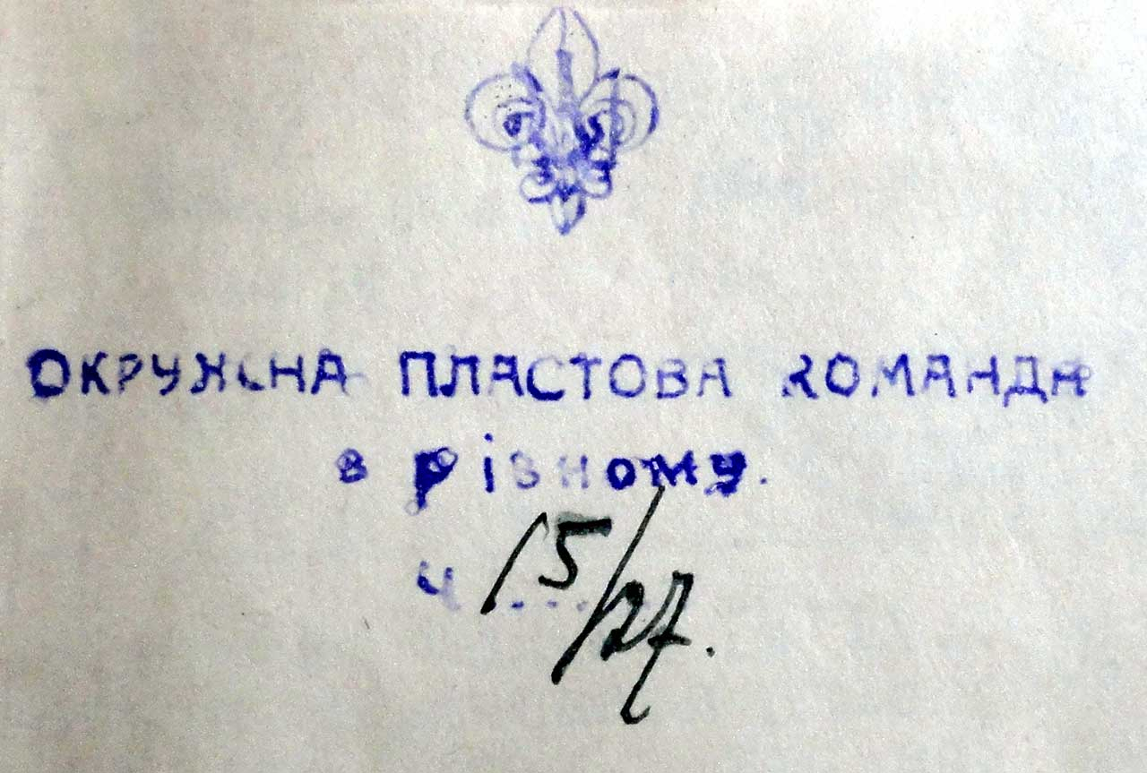 Перша – печатка Окружної Пластової Команди (ОПК) у Рівному мала прямокутну форму розміром 71х41 мм. Відбиток чорнильний, фіолетовий, із зображенням трипелюсткової лілеї з Тризубом, доброї якості. Відбиток цієї печатки зберігся на трьох документах. Перший (машинописна копія) – це звернення голови та секретаря ОПК у Рівному до всіх пластових гуртків та куренів Рівненщини про організацію Першої пластової зустрічі всіх куренів і пластових частин Волині при співучасті старших пластунів з Галичини у Олександрійських лісах, яка мала відбутися 19 серпня 1927 р. Другий документ (машинописний оригінал), аналогічний попередньому, з єдиною відмінністю, що на ньому дописано адресата. Звернення призначалося керівництву 61 пластового куреня в Олександрії. Третій документ (машинописний оригінал) – це звернення голови та секретаря ОПК у Рівному до Реферату Волині при Верховній Пластовій Команді у Львові про підготовку вище зазначеної зустрічі в Олександрії. Зокрема, в ньому зазначалося: «Окружна Пластова Команда повідомляє, що на нараді О[кружної] П[ластової] К[оманди] зі Старшими Пластунами м. Олександрії вироблено програм зустричи і пороблено певні заходи що до виконання програму. Зразки обіжника, програму і запрошень при цьому долучається. Едночасно повідомляється що до Панотця Пащевського послано запрошення о його ласкавій згоді відслужити службу Божу на місці зустрічи в мові Українській. До всіх Просвіт повітових, ріжних громадських установ, читалень Рівенського повіту та поокремих осіб розішлються запрошення. Що до Пластових частин Волині по за межами Рівенщини, то Реферат Волині зволить ласкаво поробити заходи о повідомлення про зустріч і іі програм, а також в Імени О[кружної] П[ластової] К[оманди] Рівенськоі запросити Галицьких пластунів і представникив окремих Украінських інституцій для заманіфестування Украінськоі єдности. Що до правного боку Зустрічі то справа стоятиме так: за днів шисть Товариство Просвіта в Рівному повідомить Староство про скликання і влаштовання зустрічи як це робилося підчас першоі зустрічи». Відбиток печатки на третьому документі є дещо більший розмірами від двох попередніх, а саме 72х43 мм. Це пов’язано насамперед з кількістю чорнила нанесеного на матрицю. В даному випадку його було використано більше, ніж зазвичай. Тому відбиток є більший відповідно на 1 і 2 мм. Всі три документи датовані 16 липня 1927 р. Даною сфрагістичною пам’яткою, вірогідно, користувалися з часу виникнення ОПК у Рівному аж до заборони «Пласту» на Волині у 1928 р. Відбитки цієї печатки мають ще одну особливість. На них вказувалася нумерація документів, які були завірені печаткою ОПК у Рівному. В нашому випадку – це 15/27. Перша цифра – означає, що станом на 16 липня 1927 р. цією печаткою було завірено щонайменше 15 документів. Друга – рік, тобто 1927 р.