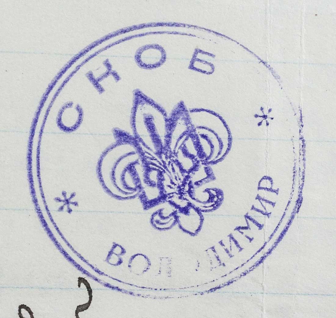 Четверта печатка – пластових куренів у Володимирі-Волинському мала круглу форму розміром 35 мм. Відбиток чорнильний, фіолетовий і чорний, із зображенням трипелюсткової лілеї з Тризубом, доброї якості. Відбиток цієї печатки зберігся на чотирьох документах. Перший (рукописний оригінал, не пізніше 25 жовтня 1926 р.) – це економічний звіт 62 пластового куреня імені Івана Франка у Володимирі-Волинському; другий (рукописний оригінал, не пізніше 25 жовтня 1928 р.) звіт 62 пластового куреня імені Івана Франка у Володимирі-Волинському за 3 чвертьрік 1928 р., третій і четвертий (рукописний оригінал, не пізніше 25 жовтня 1928 р.) звіти 63 пластового куреня імені Лесі Українки у Володимирі-Волинському за 3 чвертьрік 1928 р. Дана печатка мала свої особливості в тому, що нею завіряли важливі документи двох куренів. Такого випадку, на разі, не зафіксовано у практиці пластових відділів та структурних підрозділів Галичини та Закарпаття. На печатці пластових куренів у Володимирі-Волинському маємо також пластове гасло «СКОБ». Ще у 1913 р. один із засновників «Пласту» Олександр Тисовський писав: «Предкладаю, щоби кличем наших пластунів були отсї чотири слова, які висказують повний зміст пласту: «Сильно, красно, обережно, бистро» зібрані в однім вислові «скоб». Скоб – се заразом назва орла (Haliaёtus albicilla), величиною і силою другого по орлї сизім, прегарної птицї, що панує по всїй Українї, а гнїздить ся головно над озерами і великими ріками. Нехай ся птиця буде заразом символом україньских пластунів, нехай назва «Скоб» буде найвисшим почесним титулом пласту. Нехай укр[аїнські] пластуни здоровлять ся висловом «скоб», а відповідають словом «знаєм», пригадуючи собі тим, як їм слїд поступати, щоби стати правдивими, добрими синами свого народу». Дещо уточнену позицію щодо цього гасла наведено у наступній книзі автора «Життя в Пласті»: «Кличем инших, чужих уладів є: «Готовся». Йому в українськім Пласті відповідає клич «Сильно, Красно, Обережно, Бистро»! Значіння обох кличів те саме: Пластун має готовитися до боротьби з життям, з трудними нераз обставинами. Має готовитися, щоби показатися завжди й всюди паном положення для добра батьківщини і для власного хісна (користі. – А. С.). Щоби це довершити, він мусить вміти робити все сильно, красно, обережно й бистро. Це одначе не легка штука і до сього треба пластунови мати і як найліпше розвинути в собі всі здібности,якими обдаровує природа нормального чоловіка. До цього саме змагає Пласт».