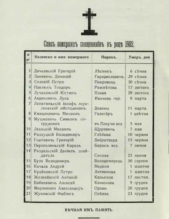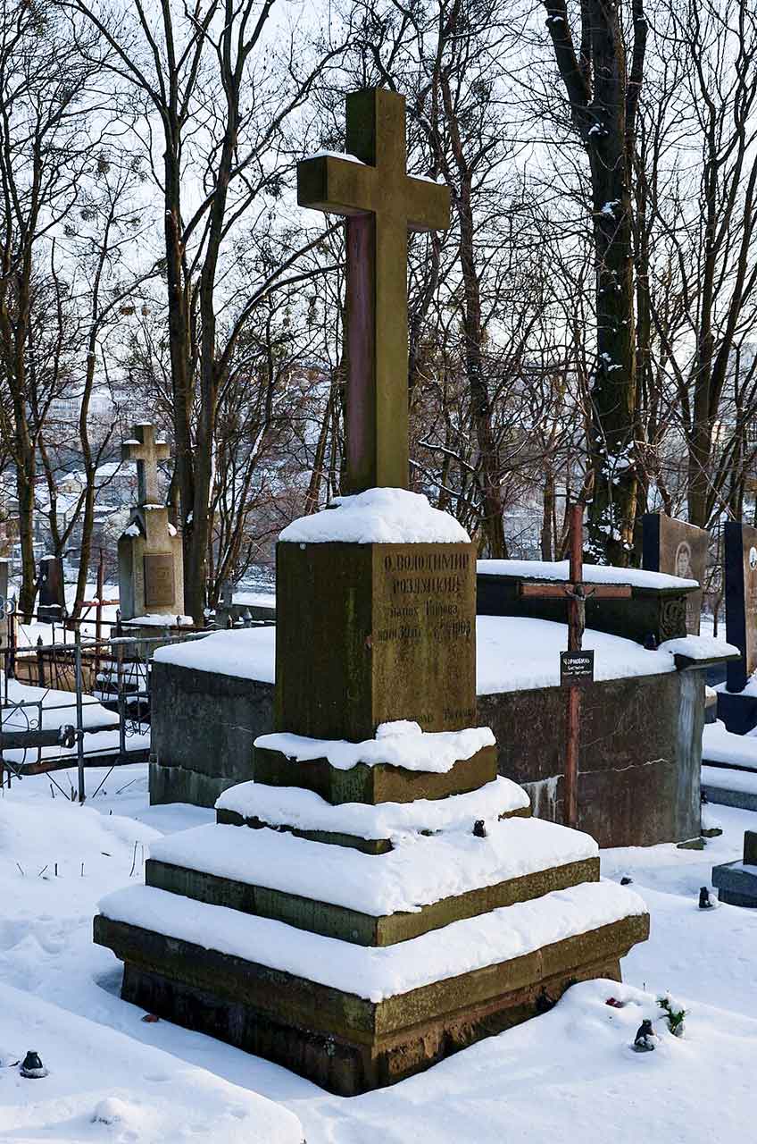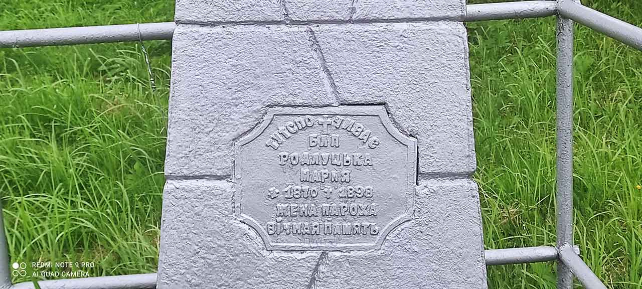 Найдавніше поховання 1898 року розташоване окремо біля церкви – кам’яний пам’ятник з написом на вилитій металевій таблиці «ТУТ СПОЧИВАЄ БЛП [блаженна покійна] РОДЛУЦЬКА МАРИЯ *1870 †1898 ЖЕНА ПАРОХА ВІЧНАЯ ПАМЯТЬ». Написання прізвища одразу насторожило й змусило звернутися до метричних книг.