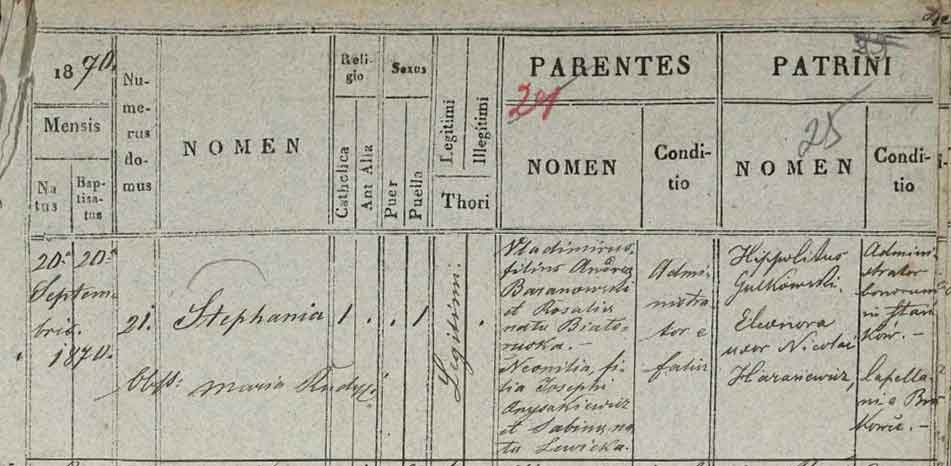 Марія Барановська народилася в Фалиші 20 вересня 1870 року в парафіяльному будинку № 21. Її того ж дня охрестив адміністратор церкви в с¸Братківці о. Микола Гарасевич, а його дружина стала хрещеною мамою дівчинки, яку назвали Стефанія.