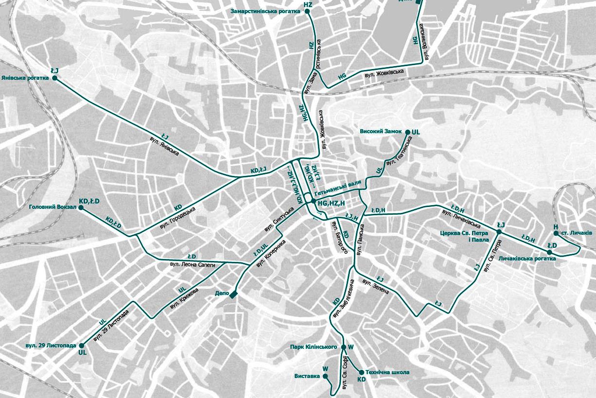 У Львові вигадано унікальну систему позначення трамвайних маршрутів – абревіатурою з двох букв. Перша – назва початкової станції, друга – кінцевої.
