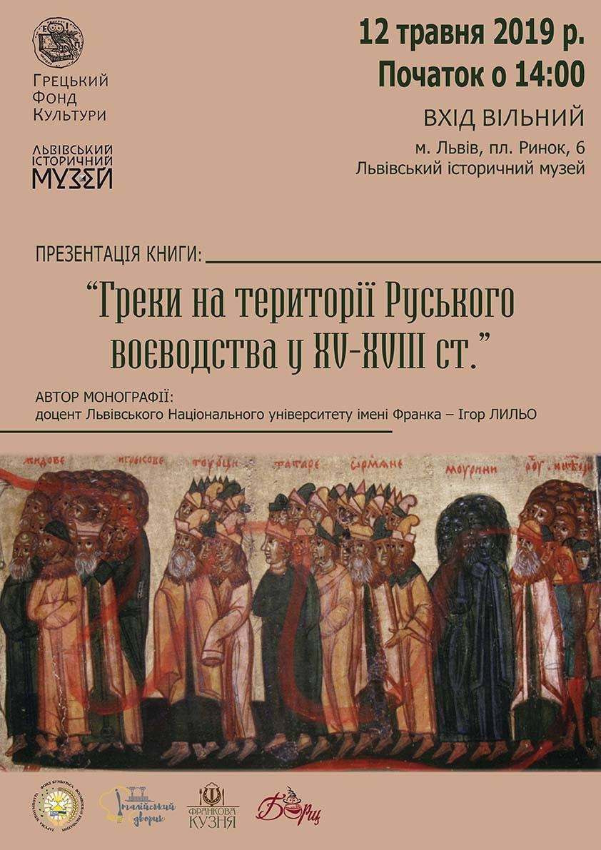 Дізнатись про ці та інші питання можна під час презентації монографії Ігоря Лиля “Греки Руського воєводства у XV-XVIII ст.” що відбудеться в приміщенні історичного музею у Львові (пл. Ринок, 6) в неділю 12 травня о 14.00.