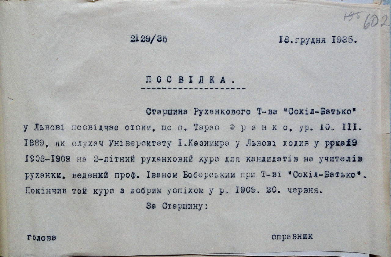 Я пізнав проф[есора] [Івана] Боберського ближче в Соколі-Батьку, де він провадив руханкові вправи [тут йдеться про рухівню «Сокола-Батька» на Руській, 20]. Академічна гімназія не мала гімнастичної залі і сама руханка була надобов’язковим предметом. Ми, себто я, мої два брати [Андрій, Петро] і сестра [Ганна], під впливом Тата [Івана] дуже горнулися до руханки і, крім шкільних годин, ходили ще постійно до Сокола на вправи. Рухівня містилася при вул[иці] Українській, званій популярно Руською. Вчив нас проф[есор] [Юрій] Семотюк, пізніше один з Будзиновських [брати Альфред та Леонард Будзиновські у червні 1901 р. заснували учительський кружок руханки при українському товаристві «Сокіл» у Львові (з 1909 р. товариство змінило назву на «Сокіл-Батько»). З вересня 1901 р. аж до початку Першої світової війни Іван Боберський керував учительським кружком руханки. Останній не лише давав можливість оволодіти основами руханки для соколів та учителів інших предметів, а й готував охочих до складання іспиту з гімнастики у Львівському університеті для отримання диплома з цього фаху. Після проходження відповідного одно- або двохрічного курсу вихованці учительського кружка, як правило, успішно складали цей іспит (зауважимо, що в екзаменаційній комісії було чимало поляків, які дуже прискіпливо та, часто, неприхильно ставилися до здобувачів-українців), й отримували дозвіл на працю в середніх школах Австро-Угорщини. Завдяки діяльності учительського кружка під безпосереднім керівництвом Івана Боберського сформувалася плеяда його послідовників: Дарія Білинська (у заміжжі Навроцька), Степан Гайдучок, Омелян Гузар, Іван Криницький, Євген Любович, Теодор Поліха, Юрій Семотюк, Савина Сидорович, Іван Сохацький, Оксана Федів (Суховерська), Петро і Тарас Франки та ін, Це середовище виховало багатьох провідних діячів і фахівців українського гімнастично-спортового руху, які проявили себе у переддень Першої світової війни, а особливо у міжвоєнний період], потім [Іван] Боберський уже в новій залі в Дністровім Домі [йдеться про рухівню «Сокола-Батька», яка знаходилася на першому поверсі будинку «Дністра» на Руській, 20].