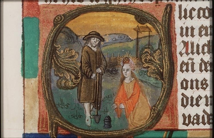 Почнемо з чарівних у свої простоті малюнків з рукописів XV століття. В першому прикладі навіть важко здогадатись, що це за чоловік з лопатою, і тільки стигмати на руках і ногах дають глядачеві підказку. Можливо, саме тому в іншому рукописі автор малюнку додав до капелюха ще й німб.