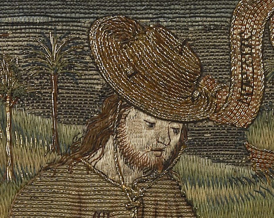 І навпаки – на наступному дуже маленькому текстильному виробі Ісуса зображено у великому крислатому капелюсі. Цей предмет – це т. зв. малий покровець, який укладається поверх чаші або дискоса під час Євхаристії.