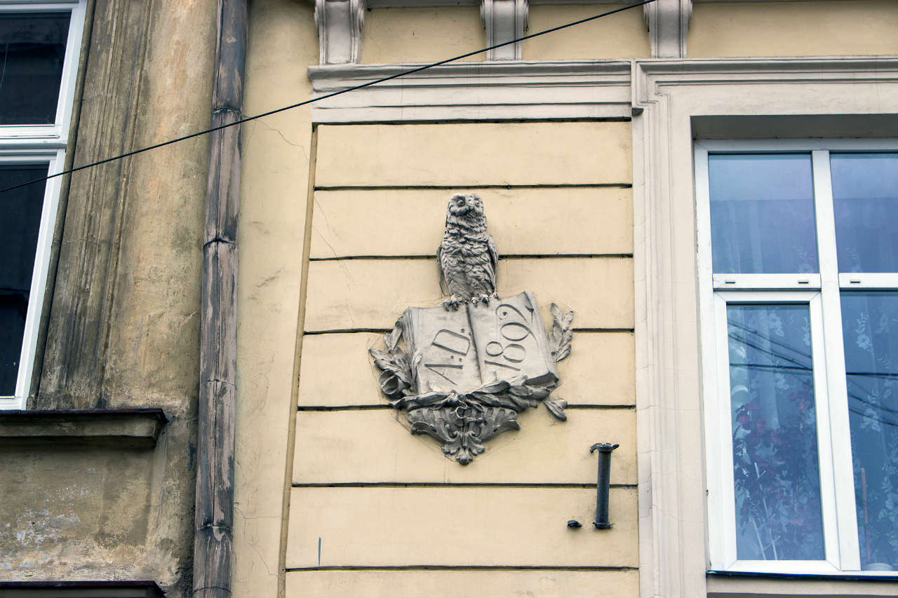 Барельєф у формі екслібрису на будинку книгарні. Фото 2015 року
